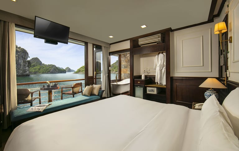 All 20 cabins have private bathtubs and balconies with panoramic views.