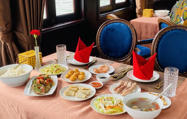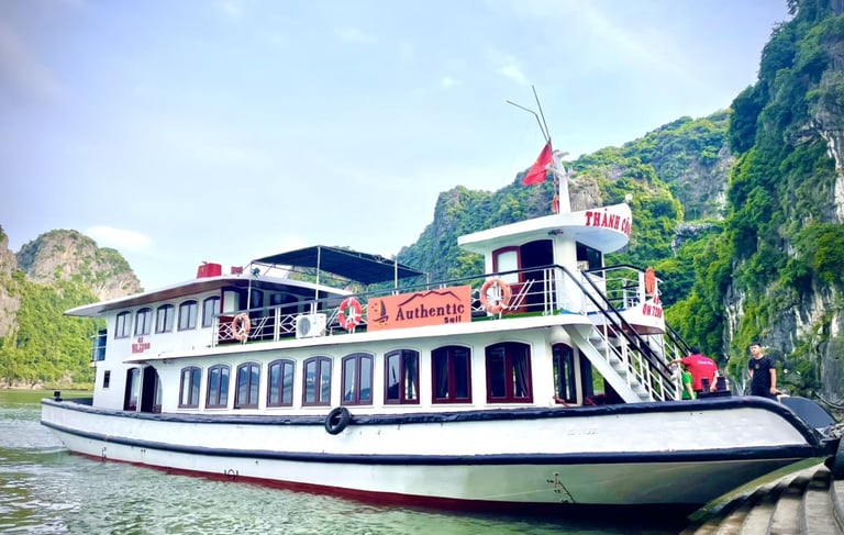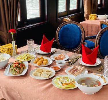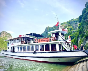• 12:30 PM: Enjoy a lunch featuring Vietnamese traditional specialties and seafood as we cruise towards the Gia Luan Cat Ba area. Here, we will take a small boat to immerse ourselves in the wonders of the Halong Bay area. Witness the stunning landscapes before continuing our cruise through the Hoa Cuong area. Along the way, soak in the extraordinary scenery of thousands of limestone islands.