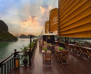 19:00 If the weather permits, enjoy dinner on the sundeck or in Ha Long Bar & Restaurant, which is on the second floor. You will have the chance to savor meals produced from premium, fresh ingredients in a distinctive fusion style that fuses the essence of traditional Vietnamese cuisine with the innovative influences of modern cuisine.