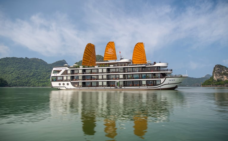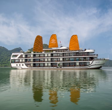 12:15 Transferred by speed boat to La Regina Grand Cruises. Welcome aboard the cruise, refresh with our welcome drink while Cruise Manager briefing cruise orientation, activities & on board safety. The boat starts to cruising to Lan Ha bay.